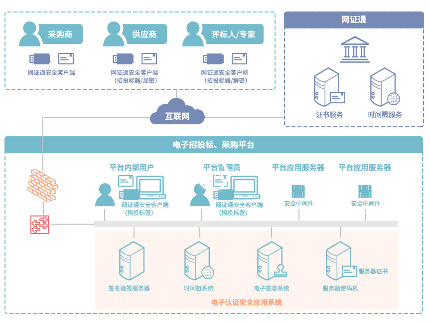 根据电子招投标行业的应用场景,在电子招投标系统所在网络中部署签名验签服务器、时间戳、服务器密码机、电子签章系统等电子签名相关产品,并由合法的第三方CA机构为电子招投标相关方签发数字证书,实现电子招投标过程中的可靠身份认证、电子签名、数据安全、操作时间可信、专家远程评标和中标通知书/电子合同的合法性需求。