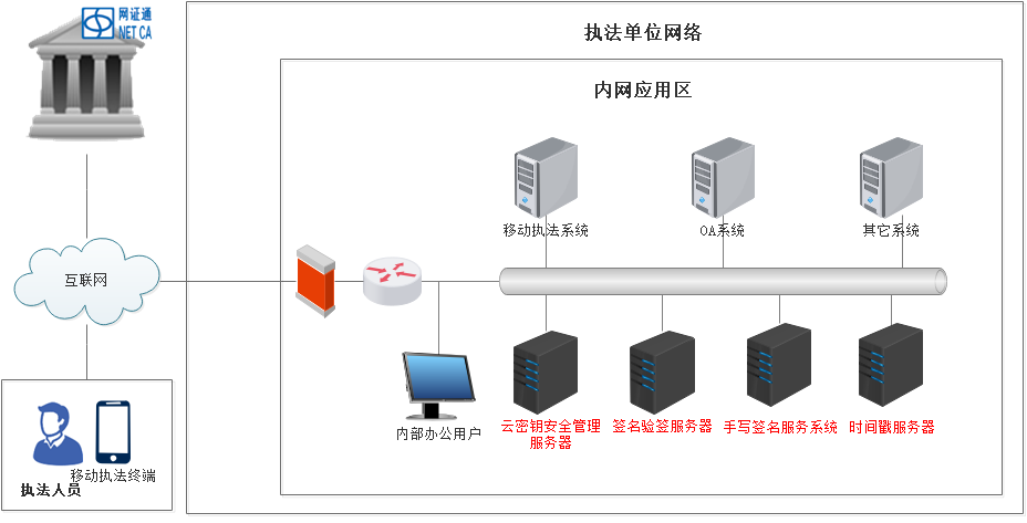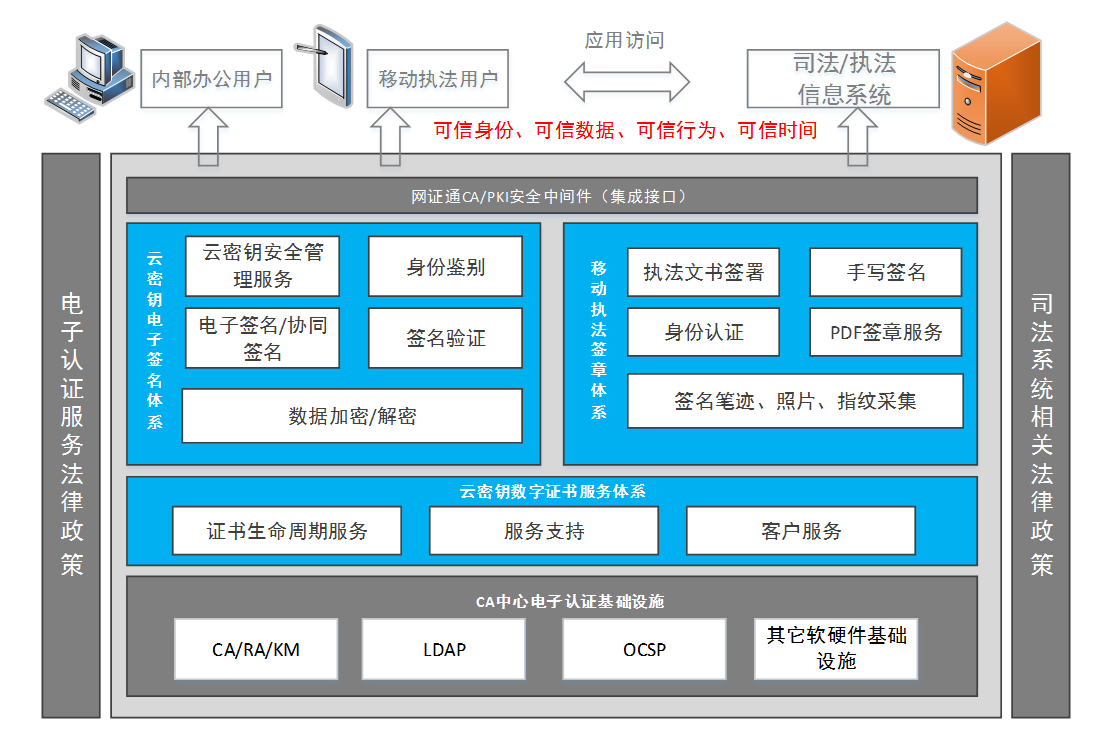 通过搭建云密钥电子签名体系,对执法单位内部办公人员和外出执法人员的密钥进行集中安全管理,同时依靠第三方合法CA机构提供的数字证书服务,兼容PC端应用和移动执法终端应用,实现司法业务系统全流程无纸化、合法化。